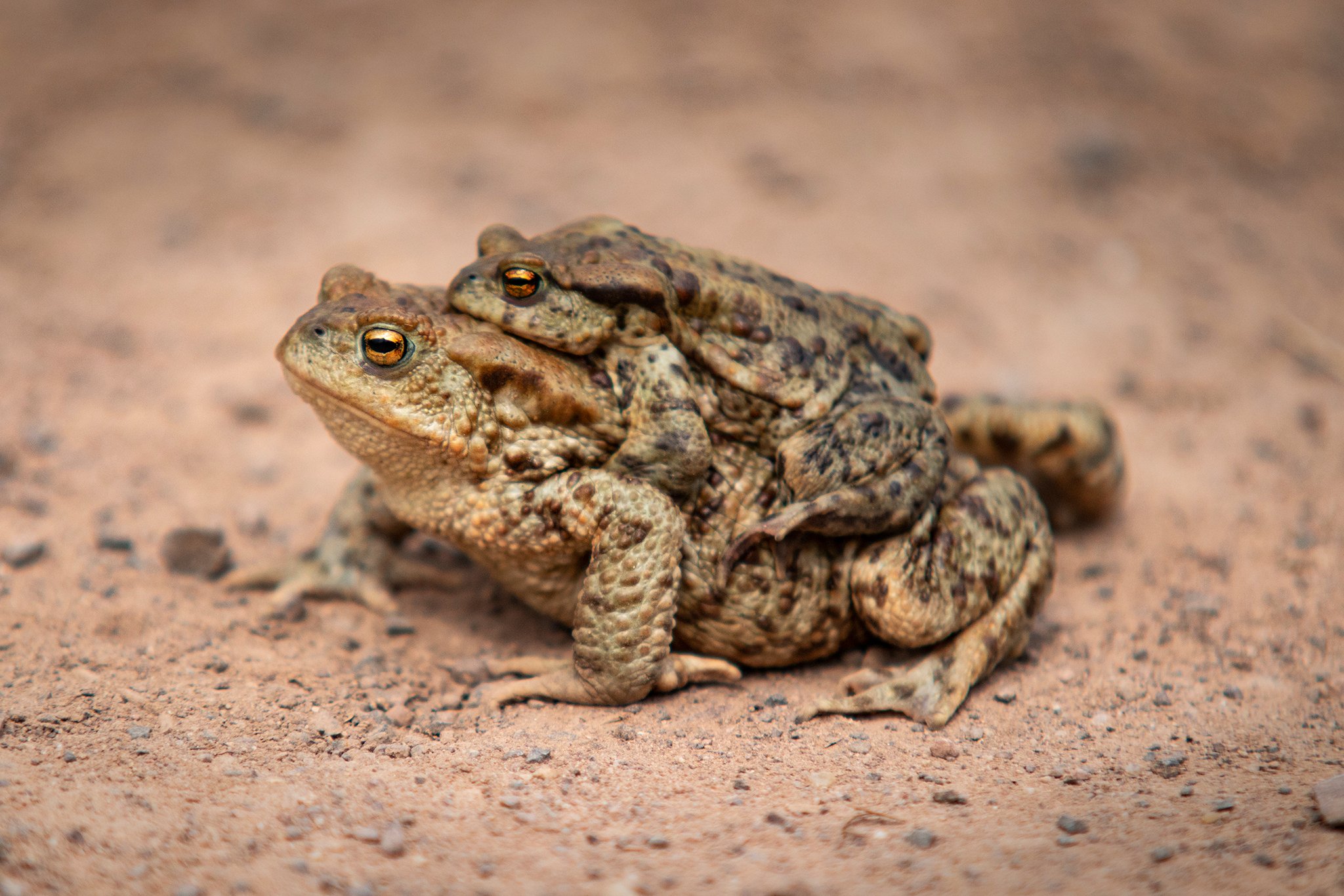 Sokołowskie żaby i ropuchy w czasie majowych godów. Na zdjęciach rupochy szare i żaby zielone (prawdopodobnie żaby moczarkowe). Wszystkie żaby po zimowej hibernacji łączą się w miłosnym uścisku, czyli ampleksusie. Samiec wskakuję na samicę, ta go nosi na grzbiecie aż złoży skrzek.